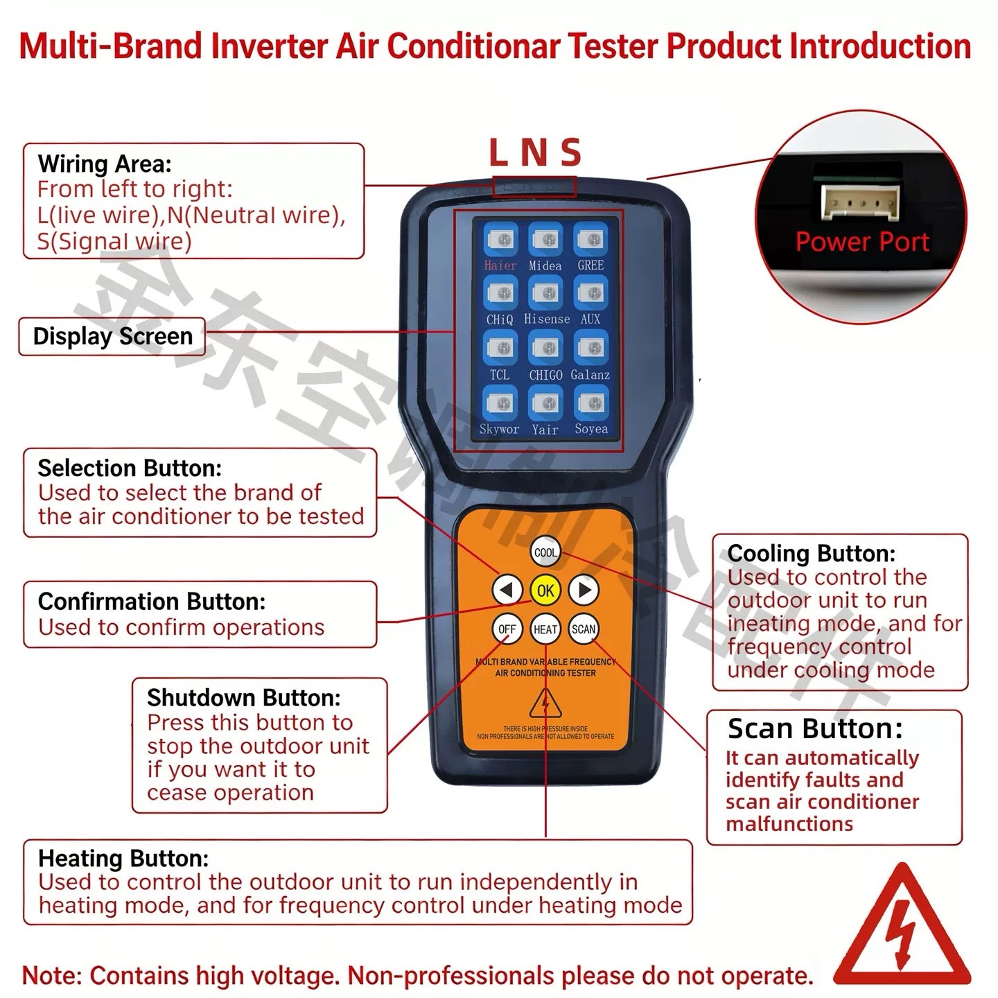 This multi-brand inverter AC tester allows quick diagnostics, system activation, and fault detection in outdoor units from multiple manufacturers.